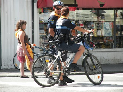 Da igual que sea hombre o mujer,que sean fiestas y haya que llevar pañoleta,que sea un país en el que llueve más que aquí,que haya que llevar casco,que haya que llevar pistola, esposas, linternay no sé cuantos cachivaches más:La police va en vélo.